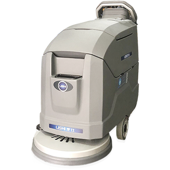 A hand-pushed floor scrubber